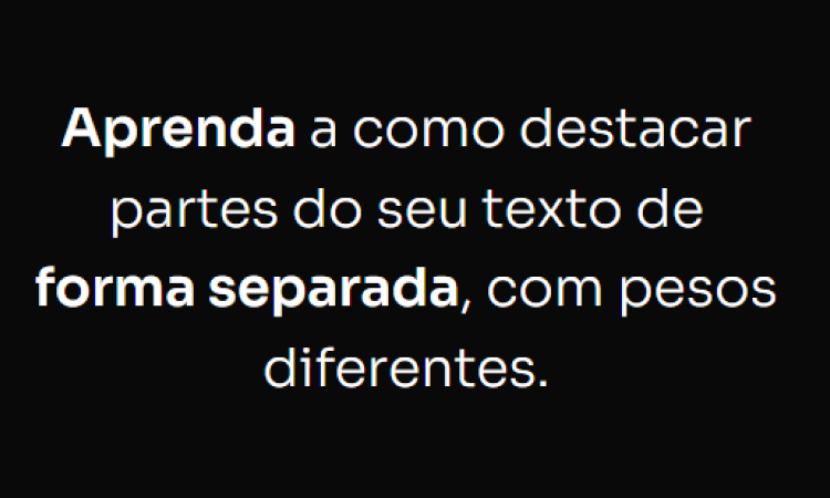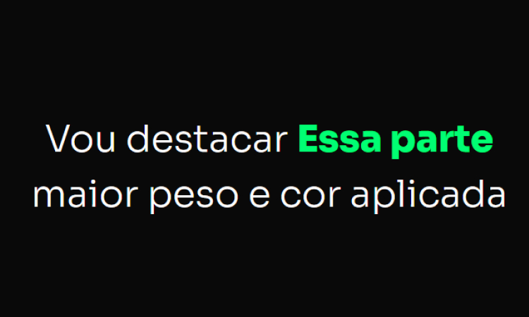 [Titulo] Alterando peso de fonte Adicione um Widget de Título (pode ser de editor de texto também, mas dai cole o código dentro da edição de código) no Elementor Não precisa definir classe CSS Coloque o código <span> com o estilo de peso de fonte (font-weight) no trecho que você quer destacar: Nesse exemplo usei: Destaque <span style=”font-weight: 600;”>essa parte</span> do texto Código Copiar Código Aprenda a como destacar partes do seu texto de forma separada, com pesos diferentes.